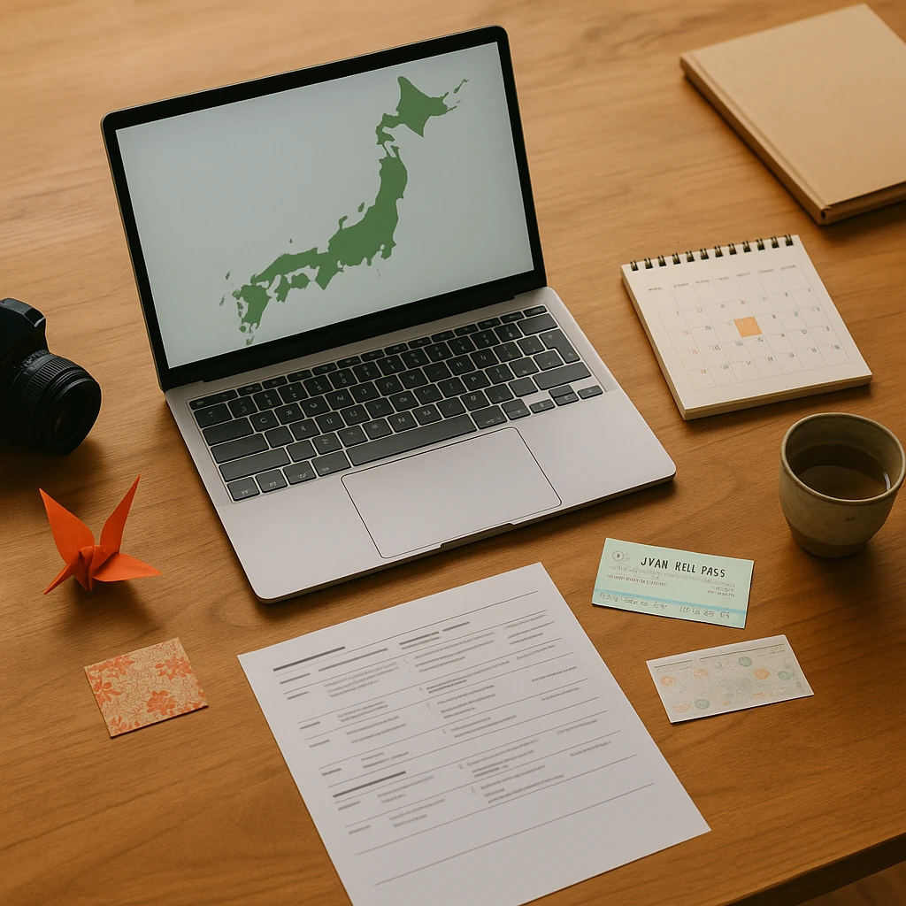 Overhead view of a wooden desk with a laptop showing a green map of Japan, a small calendar, JR Pass-style tickets, tea cup and an orange origami crane, symbolising planning a cultural trip to Japan with online tools.